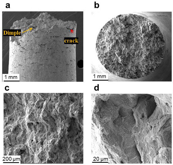 Fracture surface characterization of tensile failed 1175-WQ samples by using secondary electron images (SEM): (a) the side of the fracture; (b) the front view of the fracture sample; (c,d) the morphology of fracture under different magnifications.