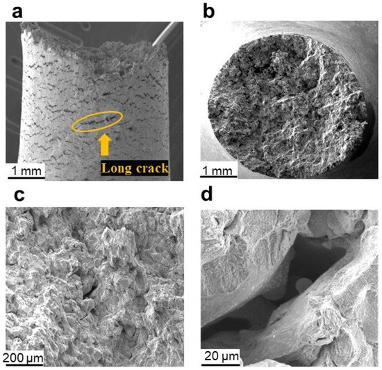 Furthermore, the detailed characterization on the fracture surface of the failed sample shows the intergranular cracking, indicating the cracking through the brittle and continuous carbide phases on the grain boundaries (Figure 8c). Dimples with diameters of approximately 50 μm could be seen on the fracture surface. In the meantime, some defects, such as the lack-of-fusion defects in Figure 8d, was identified inside the depression, which could reduce the ductility as well.