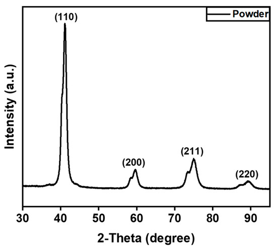 In this work, SPTAs bulk samples were prepared by powder metallurgy route, including two steps of mechanical ball milling and SPS consolidation. The equipment used was a planetary ball mill (QM-3SP4, Nanda Instruments, Nanjing, China) and SPS equipment (Labox-350, NJS Co., Ltd., Yokohama, Japan), respectively. The starting powders were W powders (99.9%, 5 μm), Cr powders (99.9%, 74 μm), Y powders (99.5%, 74 μm), and ZrH2 powders (99.9%, 74 μm). The selected powders were firstly mixed based on the composition of W-11.4Cr-0.6Y-0.4Zr (wt.%), and then were encapsulated with WC grinding balls (Ø10 mm) in an Ar atmosphere with a ball-to-material ratio of 5:1. A planetary ball mill was used for 64 h at the speed of 225 rpm/min. WC grinding balls (Ø10 mm) were then replaced to Ø5 mm WC grinding balls, followed by a milling process for 10 h. The milled powders were randomly taken and characterized by X-ray diffraction (XRD, X’ Pert PRO MPD, Cu target, Eindhoven, The Netherlands). X-ray diffraction was scanned from 30° to 90°, scanning speed was 6°/min. Figure 1 shows the XRD pattern of the milled powders. It can be determined that the W-Cr-Y-Zr alloy powders after mechanical milling has a body-centered cubic structure. In addition, the pattern shows an obvious double-peak structure, which indicates that there are two components of W-Cr matrix phase.