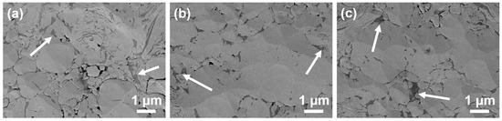 Figure 4 shows the cross-sections at of the samples sintered at different pressures. It can be seen that several unclosed pores still exist in the sample sintered at 30 MPa, and the pores gradually disappear as the pressure increases. This finding agrees with the density change, as shown in Figure 3. In addition, a few dark grey regions (as denoted with white arrows) embellish in the main grey region. Combined with the EDX characterization, the grey region is the W-Cr matrix, and the dark grey regions are the Cr-rich phases. Notably, the Cr-rich phase in case of the sample sintered with 30 MPa exhibits ribbon patterns, which is similar to the W-Cr-Zr samples interruptedly sintered at 600 °C and 800 °C in our previous study [21]. It supposes that the pattern of Cr-rich phases is related to the “local overheating” was occurred at the regions of pores and cracks. With the pressure increasing, the Cr-rich phases mainly distribute at the contacting areas between the particles, i.e., sintering necks. Combined to our previous analysis in [20], it indicates that the pressure also effects the Cr-rich phase distribution during the intermediate sintering stage.