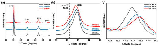 The XRD pattern of the W-Cr-Y-Zr alloys after sintering is given in Figure 5a. It shows that the W-Cr-Y-Zr alloy bulk has a body-centered cubic structure. The corresponding characteristic peaks of Y and Zr elements were not detected because their contents were below the detection limit of the XRD instrument. It is noteworthy that next to the main peak (110) of each sample, a weak characteristic peak appears, which is analyzed to be the precipitated Cr-rich phase. Zooming in on the main peak (110), as shown in Figure 5b, the main peak shifts to the left as the applied pressure increases, near the peak of the pure W phase. This indicates an increase in the lattice constant of the W-Cr matrix with increasing sintering pressure, which is attributed to the precipitation of Cr atoms with small lattice constants from the solid solution in the matrix during the sintering process. In addition, Figure 5c is an enlarged view of the characteristic peak of the Cr-rich phase, which is shifted to the right with increasing applied pressure, i.e., the concentration of Cr atoms in the Cr-rich phase increases. It proposes the result illustrated in Figure 5b.