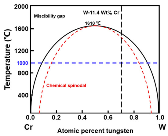 W-Cr binary phase diagram [8]. The black line represents the miscibility gap, and the red dotted line represents the chemical spinodal decomposition region.
