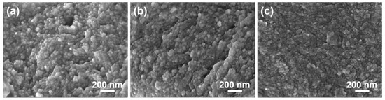 Figure 7 shows the fracture morphologies of the samples after sintering at different pressures. It can be seen that their grain sizes are very small and do not exceed 10 nm, which is consistent with the calculated results of the XRD. Notably, there is only a slight difference in grain size between the samples after sintering with different pressures and the original powders. It indicates no obvious grain growth of the samples during the sintering process. Essentially, the grain growth originates from the atom diffusion, which is related to the temperature and time. Temperature means the drive force for atom diffusion, and time relates to the diffusion distance. In this work, the samples sintered at a low temperature of 1000 °C with a few minutes, which limits the atom diffusion process. In addition, it has reported that the grain growth of W-Cr based alloys is closely related to the bulk density [11]. An obvious grain growth will occur at the relative density over than 90%. It belongs to the sintering stage III, as pointed in Figure 3a. The main densification mechanism at the sintering stage III is grain boundary diffusion, which determines the grain growth of alloys. According to the density measurement, the maximum density of the sintered samples is only 87%. Porosity makes gaps for the atomic diffusion, limiting the grain growth [11,31,32].