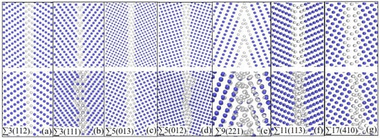 In this work, molecular dynamics (MD) simulations are performed by Large scale Atomic/Molecular Massively Parallel Simulator (LAMMPS) [] which is an open source MD software to simulate atomic interactions for a given system. The output data are analyzed by OVITO software (Version 3.5.4, OVITO GmbH, Darmstadt, Germany) []. Meanwhile, as stated above, 7 different grain boundaries including ∑3(112), ∑3(111), ∑5(012), ∑5(013), ∑9(221), ∑11(113) and ∑17(410) are built in bcc Fe based on coincidence site lattice (CSL) theory []. The GB angle of these GBs is from around 36° to 109°. Periodic boundary condition (PBC) is applied along 3 directions. In order to avoid the interaction between two GBs induced by PBC, the distance along the normal direction of GB is set to at least 14.8 nm, as listed in Table 1. A schematic of the symmetrical GB model is shown in Figure S1, provided in the Supplementary Materials. The other information for each simulation box is also included in Table 1. Atomic structures of these 7 GBs before full relaxation are shown in Figure 1. The Fe-Fe interaction is described by Fe potential developed by Mendelev et al., []. This potential has been well applied for grain boundary simulations [,,] and is suitable for the present purpose.