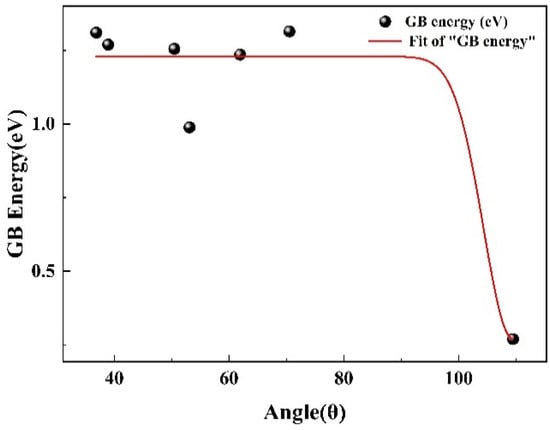 Based on the above simulation models, conjugate-gradient (CG) method is used for relaxation at 0 K, and subsequently followed by MD relaxation at 300 K and 600 K. After full MD relaxation, the CG method is applied again to obtain the atomic structure and energy at 0 K. In this way, the local structure may overcome the energy barrier and reach a lower energy state after the CG-MD-CG relaxation process. In CG relaxation, the specified energy tolerance is 10−10 and the specified force tolerance is 10−10 eV/Å3. During the MD relaxation, the timestep is 1 fs and at least 20 ps relaxation is applied for each process to ensure the system is fully relaxed at the given temperature. It should also be noted that during relaxation, the constant number of atoms, pressure and temperature (NPT) ensemble is applied in order to relax both the atomic position and simulation volume. Furthermore, for volume relaxation, each direction of the box is allowed to relax independently to fully release the internal elastic stress and obtain a more stable state for further calculations. The GB formation energy, , is then calculated according to the following equation as applied in previous studies [,,], which is defined as the difference between the potential energy of n atoms in the supercell containing GBs and the potential energy of a computational cell with the same number of atoms in a perfect crystal, divided by the cross-sectional area, S, of two GB planes.