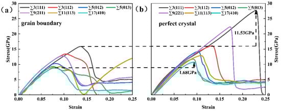 (a) Strain–stress curves of ∑3(111), ∑3(112), ∑5(012), ∑5(013), ∑9(221), ∑ 11(113), ∑17(410). (b) Strain–stress curves of single crystals corresponding to each grain boundary.