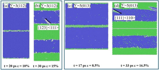 Snapshots of ∑3(112) and ∑5(013) GB under external strain effect. (a) Shows the state of ∑3(112) GB at which the phase transition starts with a strain value of 10% and (b) is the state at which the slip system in bcc phase near bcc-fcc interface is activated for ∑3(112). (c) Shows the state of ∑5(013) GB at which the phase transition starts with a strain value of 8.5% and (d) is the state at which the slip system is activated for ∑5(013) in fcc phase near the bcc-fcc interface. In the figure, the green, blue and white points are atoms in fcc, bcc and other phase states, respectively.