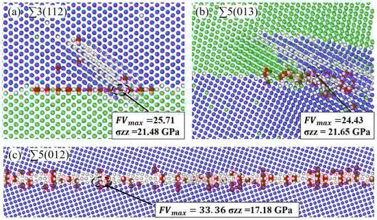 Figure 4 depicts the structural evolution of the ∑3(112) and ∑5(013) GB system under the effect of external strain. From these results, it can be found that with increasing strain, the phase transition occurs initially in the GB region and extends to the grain interior, that is, from an initial bcc phase to fcc phase, as shown in Figure 4a. In the present work, this transition occurs with strain around 10% and related stress around 12.67 GPa, as shown in Figure 3a, and is also confirmed by the atomic potential energy and displacement, that is, atoms in the phase-transition region have higher potential energy and larger displacement distance, as shown in Figure S2 in the Supplementary Materials. In fact, the phase transition from bcc to fcc under external stress has also been reported in polycrystalline Fe systems with stress values up to around 13 GPa under shock wave []. It is clear that ∑3(112) GB has a similar effect on the phase transformation of Fe system. An example of a formed fcc structure is also shown in Figure S3 in the Supplementary Materials with a lattice constant around 3.7 Å, which is slightly larger than the value (3.6 Å) of fcc-Fe under the normal condition []. Together with this phase transition, a new interface is formed between the newly formed fcc phase and the original bcc phase, as shown in Figure 4b, whose position varies with the phase transition until the slip system {123}<111> becomes activated near the interface from the bcc phase side. Dislocation nucleation is then initiated from this activated slip system and finally the dislocation network is formed with increasing strain. One possible reason for the slip system activation in bcc instead of fcc phase for ∑3(112) GB can be explained by different Schmid factors () in these two phases with external stress along <112> direction. In this case, the maximum Schmid Factor of bcc and fcc slip systems is 0.4115 and 0.4082, respectively. The larger Schmid factor in bcc phase indicates the it has higher probability to initiate the slip system in bcc phase. The value of 0.4115 in bcc phase is related to the {123}<111> slip system, same as the present simulation results, as shown in Figure 4b. In addition to above results, the larger displacement related to the phase transition is also confirmed to result in a larger free volume near the bcc-fcc interface, which is suspected as a possible reason for the change in stress field of the GB system. For example, comparing the maximum free volume in GB at states of 0 strain and 15% strain, as shown in Figure 5, it is clear that without strain, the maximum free volume (FVmax) is around 17.99 Å3 and the average value of free volume is around 7.99 Å3. While with 15% strain, FVmax reaches around 25.71 Å3 with an average value around 11.98 Å3 at the bcc-fcc interface induced by the phase transition. The stress field around this maximum free volume is around 21.48 GPa, resulting in the local stress concentration increasing and related activation of the slip system. Thus, the present results indicate that the increase in free volume induced by phase transition may be also one possible reason to induce the local stress to its critical value and the failure of GB system in bcc Fe.