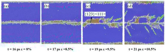 Snapshots of ∑5(012) GB evolution under external stress at different simulation times (t): (a) t = 16 ps, (b) t = 17 ps, (c) t = 19 ps and (d) t = 21 ps, respectively.