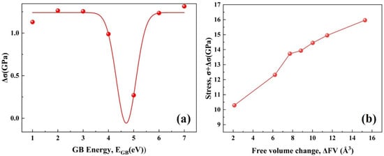 Furthermore, the dependence of critical stress () of GB failure on free volume change () has also been explored, as shown in Figure 7b, which can be described by a new equation (Equation (5)). All of these results indicate that once the free volume change has been identified, the mechanical properties of GB can be estimated.