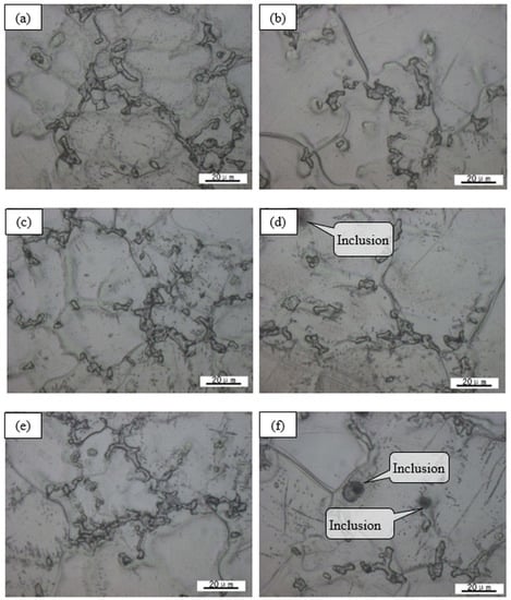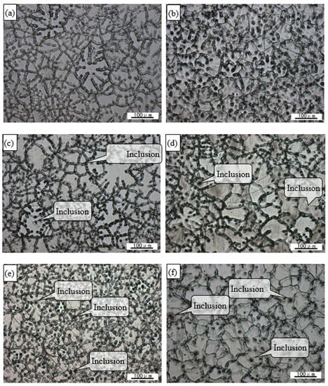 Optical microstructure of GWK alloys with different composition: (a,b) the center and edge of GWK-a ingot; (c,d) the center and edge of GWK-b ingot; (e,f) the center and outside of GWK-c ingot.