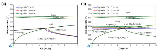 Effect of (a) yttrium and (b) zirconium on equilibrium phase diagram of the Mg-Gd based alloys.