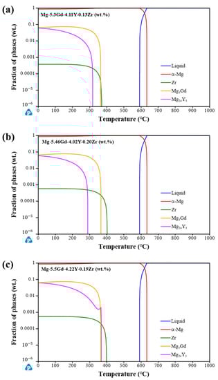 Figure 5 shows the solidification and precipitation behavior of different alloys. It is not difficult to find that the solidification interval and room temperature phase composition and content of different alloys are similar, but due to the different additions of Zr, compared with GWK-b (Figure 5b), GWK-c (Figure 5c), GWK-a (Figure 5a) alloy has a wider solid solution range, which means that it is easier to achieve the ideal solid solution effect through heat treatment. In conclusion, the precipitation behavior of Mg-Gd-Y-Zr (GWK) alloys is not sensitive to the addition of the element Y, but is extremely sensitive to the addition of the element Zr. Therefore, in order to obtain a better homogenization effect, it is necessary to control the addition amount of Zr.
