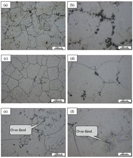 Optical microstructure of GWK-a alloy upon various homogenization temperature for 6 hs: (a,b) 480 °C; (c,d) 500 °C; (e,f) 520 °C.