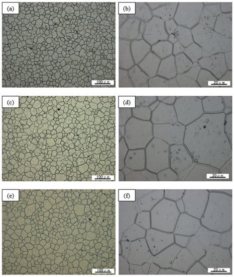 Optical microstructure of as-extruded GWK alloys: (a,b) GWK-a; (c,d) GWK-b; (e,f) GWK-c alloy.