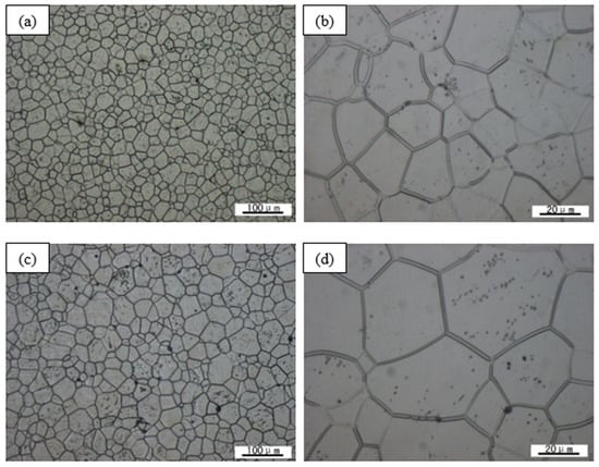 Optical microstructure of as-extruded GWK-a alloy with different extrusion ratio: (a,b) 25:1; (c,d) 17:1.