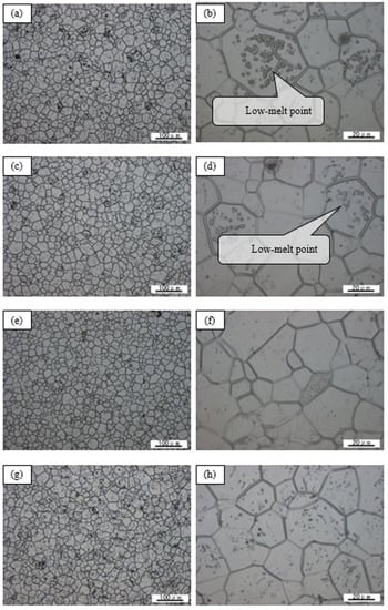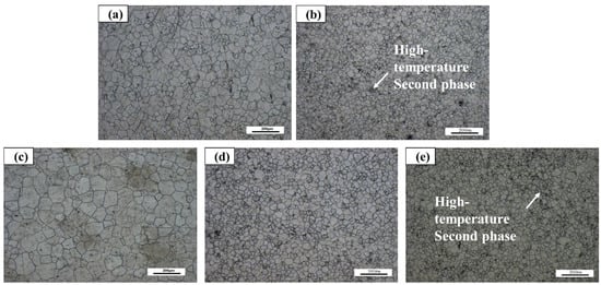 Hot working can refine the grains, make the coarse structure broken and evenly distributed, and can also improve the defects such as pores and porosity generated in the casting, so that the inclusions generally distributed along the grain boundaries in the as-cast state are distributed in a fibrous shape along the deformation direction. All factors help to further improve the room temperature mechanical properties of the alloy. Figure 7 shows the metallographic structure of the cross-section of different GWK alloy hot extrusion bars. Under this process (the preheating temperature of the billet is 430–450 °C, the preheating temperature of the die is 430 °C, and the extrusion ratio is 25), the alloys are almost completely equal to each other. Axial recrystallized grains have a grain size between 20 and −30 μm. There is only a small amount of island-shaped or ellipsoidal residual intermetallic compounds on the grain boundaries. By comparing the homogenized structure in the previous text, it can be judged that this is the high melting point phase remaining after solid solution. The aforementioned inclusions are not obvious. It is speculated that the inclusions are extruded during extrusion. During the process, it is broken and dispersed at the grain boundaries of the recrystallized structure.