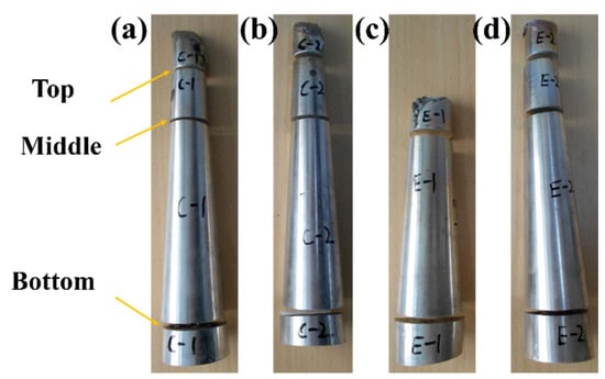 In order to verify the casting alloy yield and billet quality stability, three semi-continuous castings were compared in this paper, which were distinguished as a, b, and c, respectively. In Table 1, the chemical composition of the upper, middle, and lower parts of the alloy in the three tests is basically the same as the design value, and the theoretical density and the measured density are also very similar, indicating that the casting and pouring process of the GWK alloy is stable and reliable, and the composition is uniform.