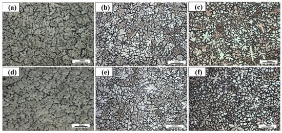 Optical microstructure from the top, middle, bottom of as-cast (a–c) GWK-a and (d–f) GWK-c alloys after flammability test.
