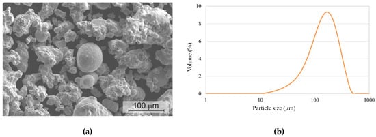 (a) SEM micrograph and (b) granulometric distribution of the Fe Atomet 1001HP powder used in the CDEC experiments.