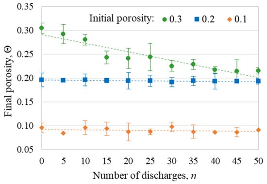 Final porosity of the compacts (Θ) versus the number of discharges, as measured by the Archimedes’ method.