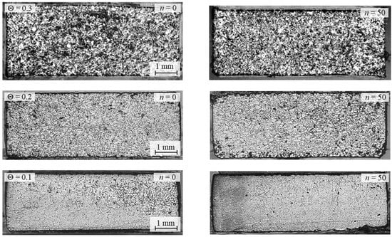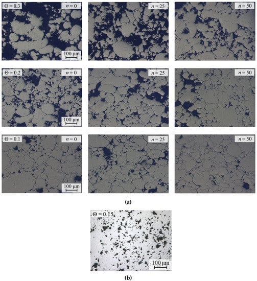 The final porosity Θ of the CEDC compacts, according to the Archimedes’ values, as a function of the initial porosity and the number of discharge cycles n (i.e., the applied energy), is given in Figure 3. Results obtained from the compacts measurement and weight give porosity values slightly higher, with the same trend. For both methods, a deviation lower than 0.03 is obtained from the measurements of similar specimens.