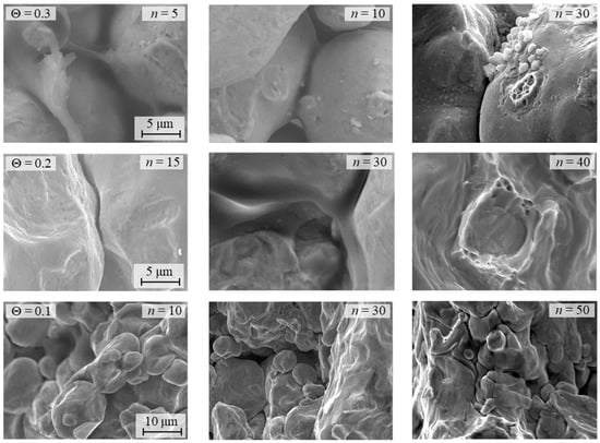 The fracture surfaces of mechanically broken specimens were studied to observe the bonds or necks between particles after the discharges. Figure 6 shows the fracture surface after a different number of discharge cycles in the specimens with an initial porosity of 0.3, 0.2, and 0.1. For Θ = 0.3 and after five discharges, weak bonds start to appear between particles, being easily broken. Necks seem to get more and more stable with the number of discharges, up to form good bonds revealed by the appearance of features characteristic of a ductile behavior, as shown for 30 discharges. In addition, the high temperature reached in some contacts seem to reveal the melting and quenching generated by the Joule heat, observing a colony of microparticles adhered to the surface, as described for tungsten powder in []. Therefore, for an initial high porosity, the powder column has a high electrical resistance, generating enough energy by Joule effect for the consolidation process and densifying the powder mass.