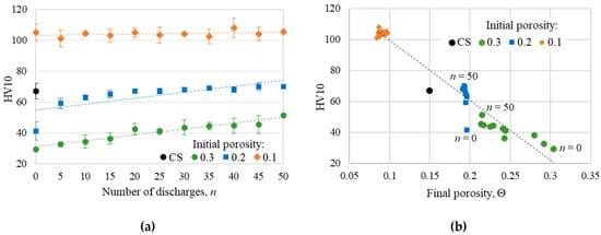 A linear trend between microhardness and final porosity is shown in Figure 7b, with values ranging from 29 to 109 HV10. It also shows the influence of the number of discharges, affecting both the final porosity and the microhardness for an initial porosity of 0.3, only affecting the microhardness for an initial porosity of 0.2, and not showing any influence for an initial porosity of 0.1, with values grouped inside the standard deviation.
