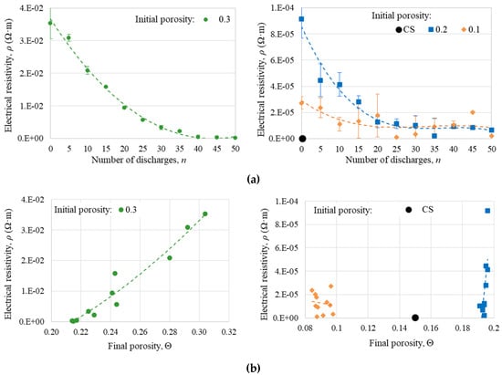 As shown, the resistivity decreases with a decreasing initial porosity and an increasing number of discharges because of the decrease in porosity and better contacts between particles. Again, the effect of the electrical discharges is clear for 0.3 and 0.2, but not for a lower initial porosity of 0.1.