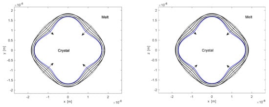 Figure 3 show the cross-sectional curves of the interface morphology of a particle growing in an undercooled melt under the influence of anisotropic interface kinetics.