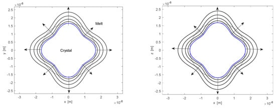 as a small parameter and seek the asymptotic solution for the free boundary problem for the shape of the crystal–melt interface in Equations (10)–(20). The anisotropic interface kinetics is assumed to be of the same order of magnitude to the small parameter,