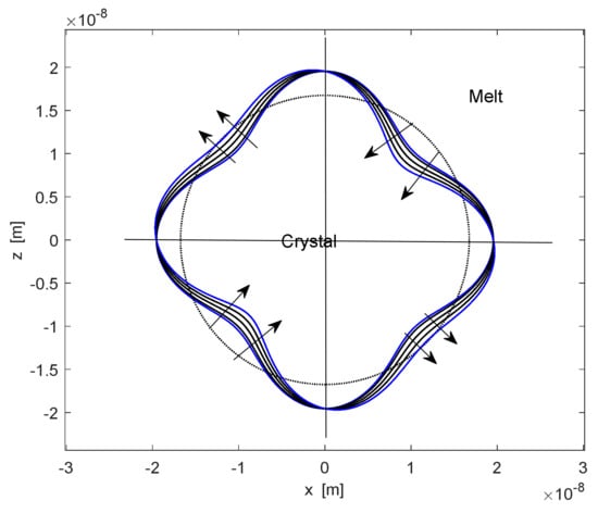 Figure 2 shows the cross-sectional curves of the interface morphology of the particle under the influence of anisotropic interface kinetics at different times after the initial inward growth of some parts of the interface. When the inward decay proceeds up to a certain distance from the time