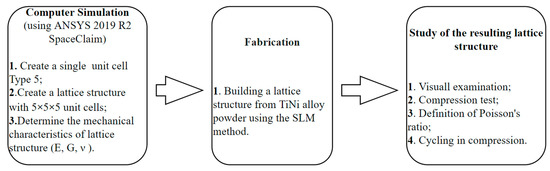 The priority task can be clearly defined based on the above-described problems: development and fabrication of TiNi alloy lattice structures with low elastic modulus and negative Poisson’s ratio. The solution to this problem must be considered in a complex way, using the possibilities of computer simulation for the initial programming of the properties of the lattice structure, and production of this lattice structure by the SLM method from TiNi alloy powder. Accordingly, it is necessary to develop a complete methodology for obtaining lattice structures from the TiNi alloy, which makes it possible to obtain products for various purposes with different properties.