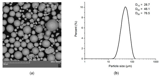 Samples were fabricated from spherical powder of TiNi alloy (with atomic percent of 49% and 51% for Ti and Ni, respectively) by CNPC Powder, Shanghai, China, using the electrode induction melting gas atomization method (EIGA). A SEM image of the alloy powder is shown in Figure 2a. Figure 2b presents the powder particle size.