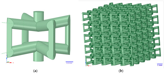 A single unit cell with negative Poisson’s ratio was simulated with the ANSYS 2019 R2 SpaceClaim software package (ANSYS 2019 R2, Ansys Inc., Canonsburg, PA, USA). This single unit cell topology was named Type 5. The single unit cell has dimensions of 2 mm × 2 mm × 2 mm and 80% porosity. A lattice structure consisting of 5 unit cells on three axes, i.e., 5 × 5 × 5 cells with total dimensions of 10 mm × 10 mm × 10 mm, was generated on the basis of the simulated single unit cell. A Type 5 single cell with negative Poisson’s ratio and the lattice structure itself are shown in Figure 3a,b, respectively. The mechanical characteristics of the simulated lattice structure with 5 × 5 × 5 unit cells (Young’s modulus (E), shear modulus (G), and Poisson’s ratio) were determined by computer simulation of compression experiment with static load in elastic region, using ANSYS 2019 R2 SpaceClaim software package. Initial simulation data: Young’s modulus of austenite—77 GPa, Young’s modulus of martensite—30 GPa, Poisson’s ratio—0.33, shear modulus—29 GPa, density—6500 kg/m3. To determine Young’s modulus, the normal displacement boundary condition without friction was applied to the lower faces of the lattice structure and the small displacement boundary condition was applied to the upper faces. For shear modulus, the normal displacement boundary condition without friction was applied to the lower and upper faces of the lattice structure, and the small displacement boundary condition was applied to the side faces.