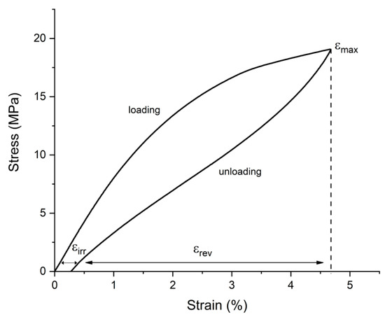 Compression test and cycling in compression were carried out using a Zwick/Roell Z100 single-axis floor-mounted testing machine (Zwick/Roell, Ulm, Germany). The compression direction was perpendicular to the building direction (BD). Cycling loading stress varies from 9 to 20 Mpa. An example of reversible and irreversible strain during cycling under the superelasticity effect is shown in Figure 4. A Gleeble 3800 testing machine (Dynamic Systems Inc., Austin, TX, USA) with a strain gauge type hot zone transducer (Hot Zone L-Strain) and crosswise LVDT type gauge (C-Gauge) was used to determine longitudinal strain and lateral strain of compressed samples for Poisson’s ratio calculation. The Poisson’s ratio was calculated by formula (2) [39] based on the obtained data: