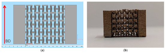(a) Orientation of lattice structure based on a single Type 5 cell with bases during fabrication by the SLM technique, with the building direction (BD) indicated; (b) Fabricated lattice structure based on a single Type 5 cell.