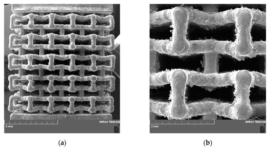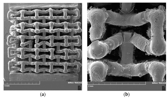 An important feature of the lattice structures with this single cell topology is their compression to failure behavior, namely, compaction. You can clearly see that on the stress–strain curve (Figure 9b). It is clearly visible that, after an initial failure of one or several cells accompanied by a voltage drop, the voltage continues rising until the next failure. This compresses and compacts the sample, causing the stress to increase even more, which is clearly visible in the stress–strain curve for sample 1 (Figure 9b). Such compaction of the sample results in its complete failure. Figure 10 shows SEM images of sample 2 with partially fractured cells. It should be noted that despite compaction, the compression failure of the sample actually occurs in the same way as for the classical material, i.e., at an angle of 45°. This is clear from Figure 10a, which shows that a line can be drawn through the fractured cells from the upper left corner of the lattice structure to the lower right corner.
