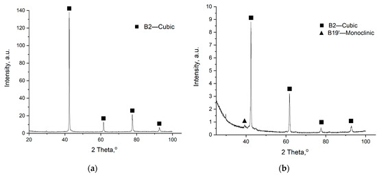 Figure 7 shows XRD patterns of the initial powder and the fabricated lattice structure sample. According to the XRD patterns, only the high-temperature B2 phase (austenite) with a cubic structure is observed in the initial powder. The fabricated lattice structure sample also mainly contains the high-temperature B2 phase (austenite) with a cubic structure. At the same time, there was a small amount of the low-temperature martensite phase B19′, which had not been previously contained in the initial powder. Secondary phases were not detected.