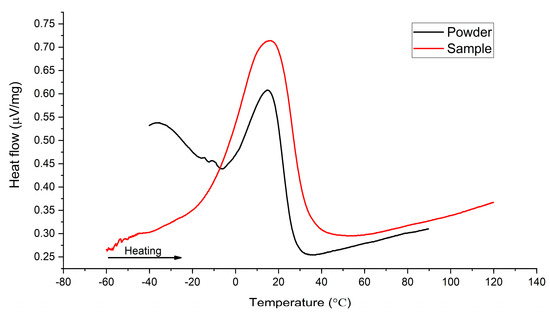 The martensite phase content indicates a possible rise in transformation temperatures due to nickel evaporation during printing, which could lead to incomplete transformation at room temperature. The phenomenon of nickel evaporation during SLM has been described in previous papers [41,42,43,44,45]. This assumption is validated through the DSC curves (Figure 8) plotted for the initial powder and fabricated lattice structure during heating.