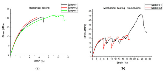 Mechanical compression test results: (a) Stress–strain curves for three samples plotted before initial failure; (b) Stress–strain curves for two samples plotted during compaction.