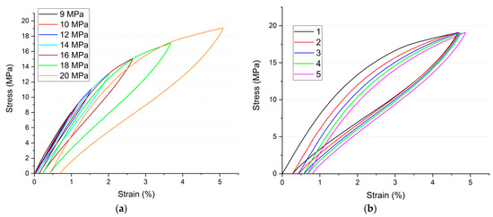 Sample cycling by compression loading: (a) Cycling with stress rising from 9 to 20 MPa; (b) five cycles under 20 MPa.