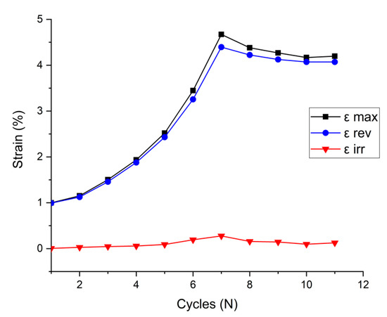 Maximum, reversible, and irreversible strain as a function of cycle.