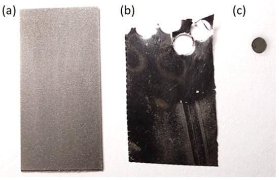 In this study, we investigated shock properties of an additively manufactured CoCrFeMnNi HEA sample using a laser-based flyer plates system with micron-scale disk impactors. The HEA samples were manufactured using a laser-based directed energy deposition (DED) technique, Laser Engineered Net Shaping (LENS) []. The samples provided for testing were rectangular with an original thickness of approximately 300 μm and are shown in Figure 1. In order to create the disk impactors required for testing, these samples were then polished using increasingly fine-grit sandpaper to reduce the specimen to the desired thickness while maintaining planarity along the surface in order to ensure consistent impact velocities and profiles. Additionally, the polishing process resulted in a mirrored finish along the surface, increasing the flyers’ reflectivity. This mirrored finish was intended to maximize the reliability of photon Doppler velocimetry (PDV) measurements. Finally, 1.5 mm diameter flyers were punched from these prepared specimens for testing. Punching of the disks was reserved for the final step so as to avoid creating irregularities of the both the surface and overall shape of the flyers.