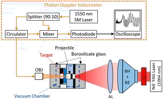 Schematic of laser flyer launch system with photon Doppler velocimeter (PDV). BE = beam expander, BH = beam homogenizer, OBJ = objective lens, AL = aspheric lens, FI = Faraday isolator, Reprinted with permission from ref. []. Copyright 2022 Springer.