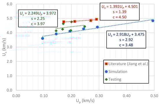 Us–Up relations found in experiment compared to MD Simulation and previous literature [] which allows equation of state to be derived.