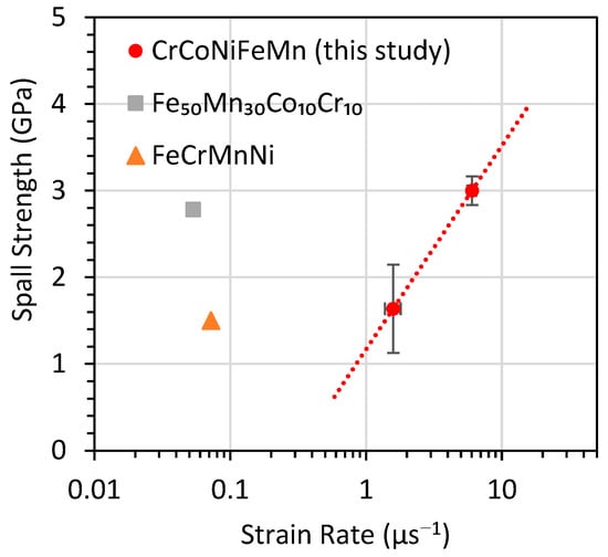 In Figure 7, the data point corresponding to the 50 µm aluminum flyers had a strain rate of 1.58 µs−1 with an observed spall strength of 1.64 GPa. Meanwhile, for the 25 µm flyer case, where the impact velocity was nearly double that of the 50 µm, the strain rate was 6.02 µs−1, with a spall strength of 3.00 GPa. The higher velocity impacts resulted in both a higher strain rate and greater spall strength being observed within the HEA samples. This positive correlation between these two variables is expected. Previous studies on similar materials observed similar behaviors [,].