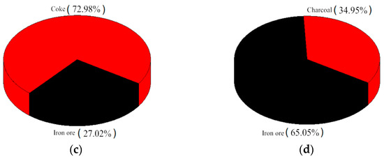 According to the sulfur and nitrogen contents in different raw materials, a distribution map of sulfur and nitrogen in the sintered mixture was drawn, and the main sources of SO2 and NOx in flue gas were clarified. The sulfur and nitrogen distribution maps in raw materials are shown in Figure 1a,c when coke was used as the sintering fuel, while Figure 1b,d show charcoal as the sintering fuel.