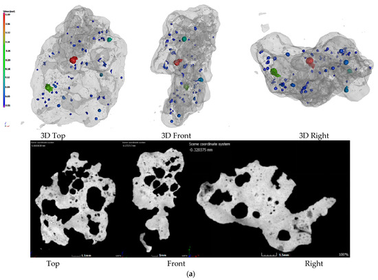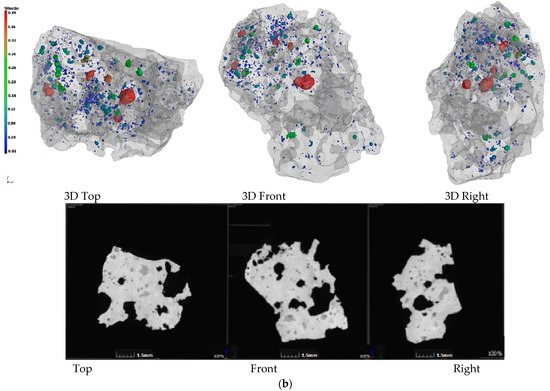 In order to further study the influence mechanism of biomass charcoal on sinter strength, yield, and reducibility, the internal sinter pore structure was obtained by X-ray CT experiments. The effect of charcoal content on the internal structure and porosity of sinter was also studied. The results are shown in Figure 2.