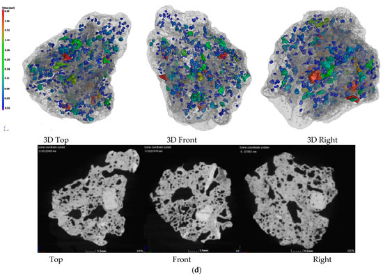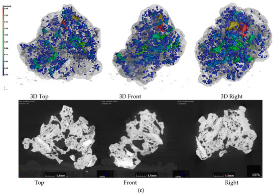 Figure 2 shows the CT photos of the 3D pore structure and slices of the sinter. Figure 2a shows the CT photos of the sinter obtained by conventional coke sintering. The pore distribution shows that the energy density of the coke breeze in the conventional sintering mixture was high, the volume was small, the distribution segregation was significant, the local high temperature in the sintering mixture was caused, the number of the mesopores was small, and the pore diameter was large. Therefore, the amount of fuel and the temperature of the combustion layer should be strictly controlled in the sintering process, otherwise macroporous and thin-wall sinter could form more readily, which affects the sinter strength. Figure 2b–d are the CT photos of the sinter obtained by 20%, 40% and 60% charcoal, respectively. Compared with Figure 2a, with the increase in charcoal content in sintered mixed fuel, the macroporous amount in sinter decreased gradually, the micropore content increased gradually, the pore distribution was uniform, and the pore structure was developed. The reason for this result was that the density of charcoal was small, so with the increase in charcoal content, the volume of the sintered mixed fuel increased gradually. In the mixing process of the sintered raw materials, the distribution of mixed fuel was uniform, the energy was dispersed, and the heat distribution was uniform in the sintering process, which was beneficial to the formation of the sinter liquid phase and the formation of uniformly distributed pores in the combustion reaction process. Therefore, through the internal pore structure, it could be seen that adding an appropriate amount of charcoal in the sintering process was beneficial to forming a uniform sinter liquid phase and uniform distributed pores, which could avoid macropores and improve sinter reducibility and sinter strength (the results presented in Section 3.1 and Section 3.2). However, when the charcoal amount was too large, the pore structure in the sinter was overdeveloped, which was beneficial to the reduction reaction of sinter, but was not conducive to the improvement in sinter strength. Based on the internal structure and strength index of sinter, it was suggested that the most suitable addition of charcoal in the sintering process was 40%.